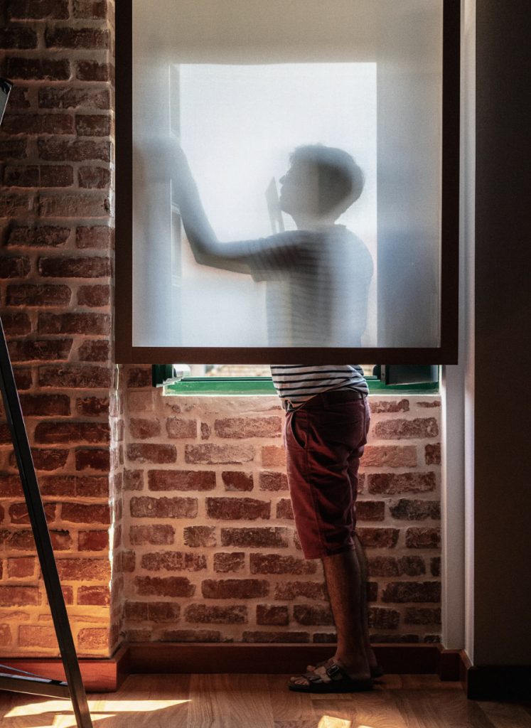 Obscurecendo a sala e permitindo a entrada de luz por pequenos orifícios localizados nas janelas da Casa. O exterior das ruas de Pombal entra como projeções luminosas, criando uma simbiose entre exterior e interior.
