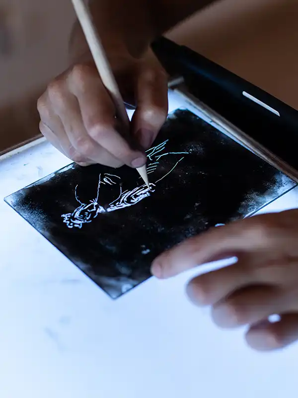 Esta oficina é dedicada à prática do cliché verre, uma técnica histórica que combina desenho ou pintura com processos fotográficos, sem recurso à câmara.